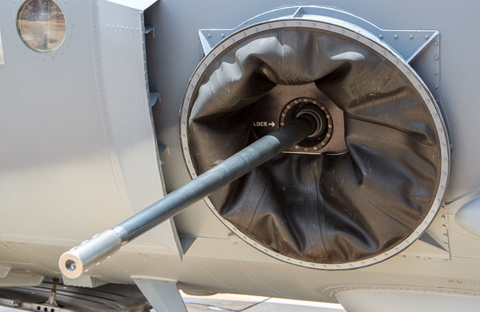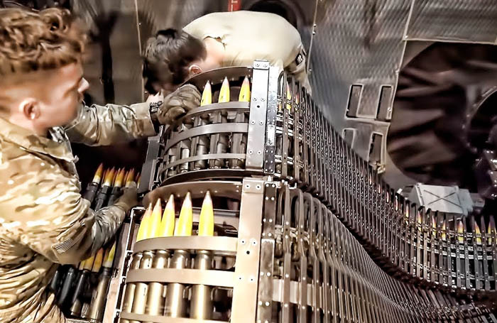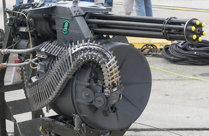 Armed with a 30 mm M230 chain gun carried between the main landing gear. The M230 Chain Gun is a 30 mm, single-barrel automatic cannon.