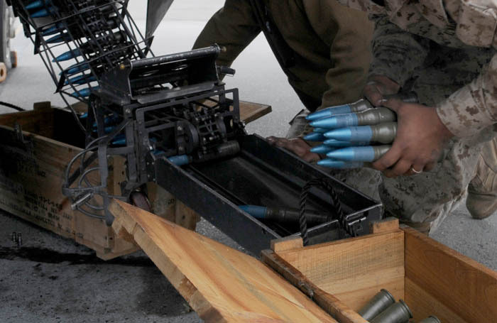 The GAU-12 Equalizer is a 25 mm, 5-barreled, Rotary cannon that is mounted under-fuselage in the left pod, with 300 rounds of ammunition in the right pod. The GAU-12 has a rate of fire between 3,600–4,200 rpm.