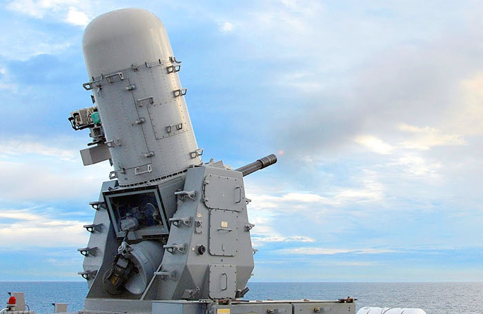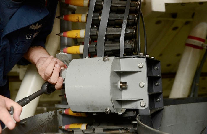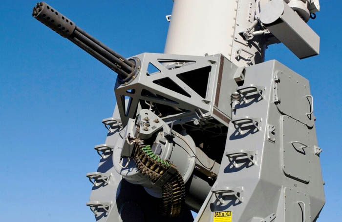 Fast-reaction, detect-thru-engage, radar guided 20-millimeter gun weapon system. The Phalanx CIWS consists of a radar-guided 20 mm Vulcan cannon mounted on a swiveling base with a rate of fire between 3,000 – 4,500 rpm. Deigned as an anti ship, missile, and aircraft weapon system. The ammunition handling system has two conveyor belt systems. The first takes the rounds out of the magazine drum to the gun; the second takes empty shells or nonfired rounds to the opposite end of the drum.