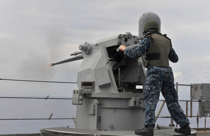 The MK 38 is a 25 mm machine gun system (MGS) installed for ship self-defense to counter Fast Attack Crafts and Fast Inshore Attack Crafts. The Mk 38 Mod 3 provides a range of 2.5 kilometers and selectable rates of fire from single to 180 rounds per minute, and fires all U.S. Navy-approved 25mm ammunition. It can be remotely operated from the combat information center or other protected ship structures, allowing operators to remain safe and out of harm’s way. It utilizes dual feed for 25 mm main gun and single feed for 7.62 mm gun.